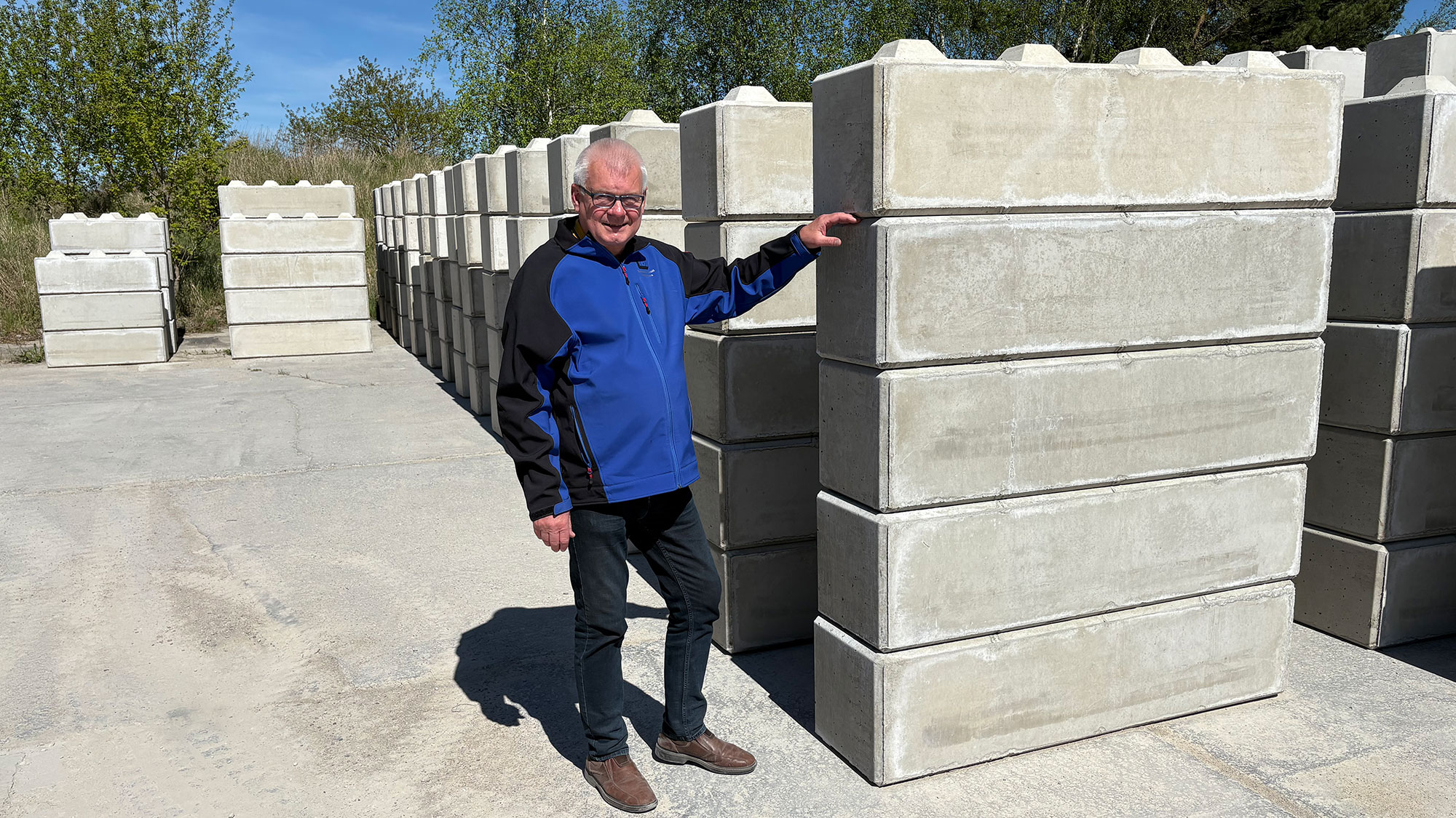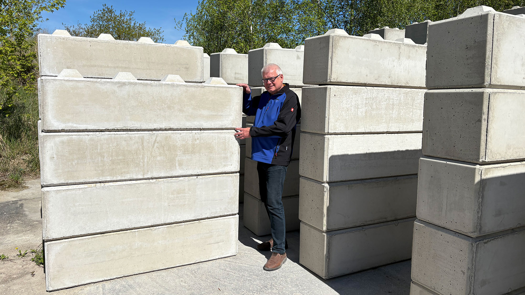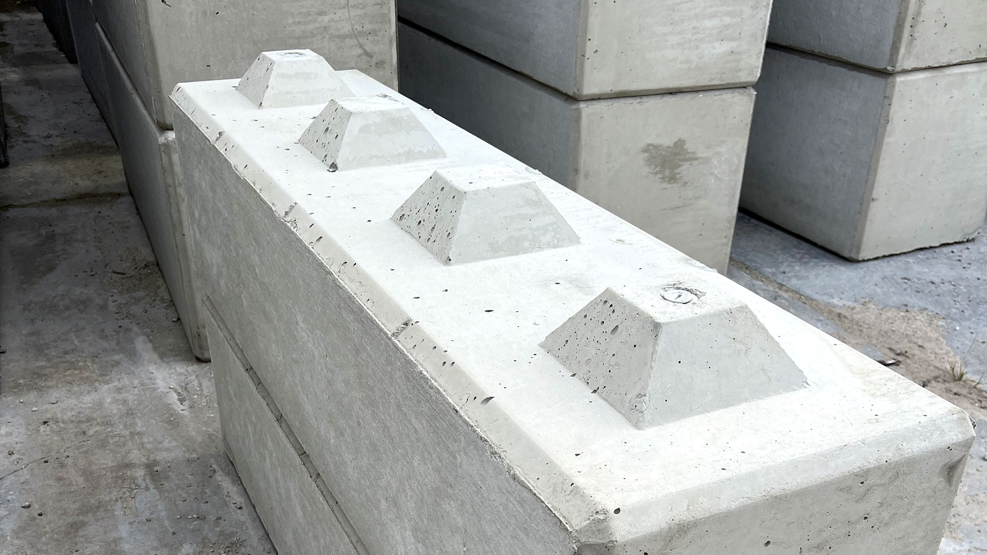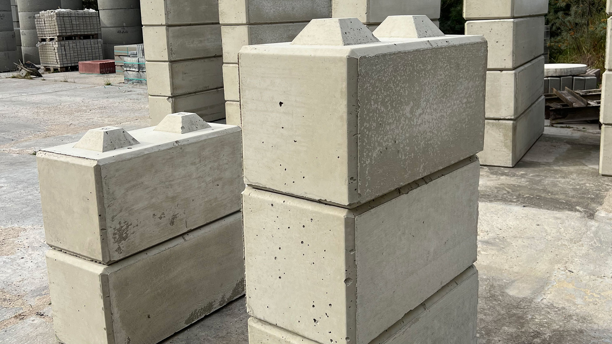 Die Betonstapelblöcke verfügen über eine Rasterverzahnung. Eine Seite ist schalungsglatt, die andere ist abzugsrau. Statiknachweis ist bauseits zu erbringen. Jeder einzelne Block lässt sich durch die Rasterverzahnung einfach stapeln und verlegen. Dadurch ist es möglich, die eigene Konstruktion zu jedem gewünschten Zeitpunkt umzustellen oder zu erweitern. Die Handhabung wird durch einbetonierte Gewindehülsen vereinfacht. Die Betonstapelblöcke sind so beschaffen, dass Hebeschlaufen einfach eingedreht werden können, was zusätzliches Werkzeug überflüssig macht.